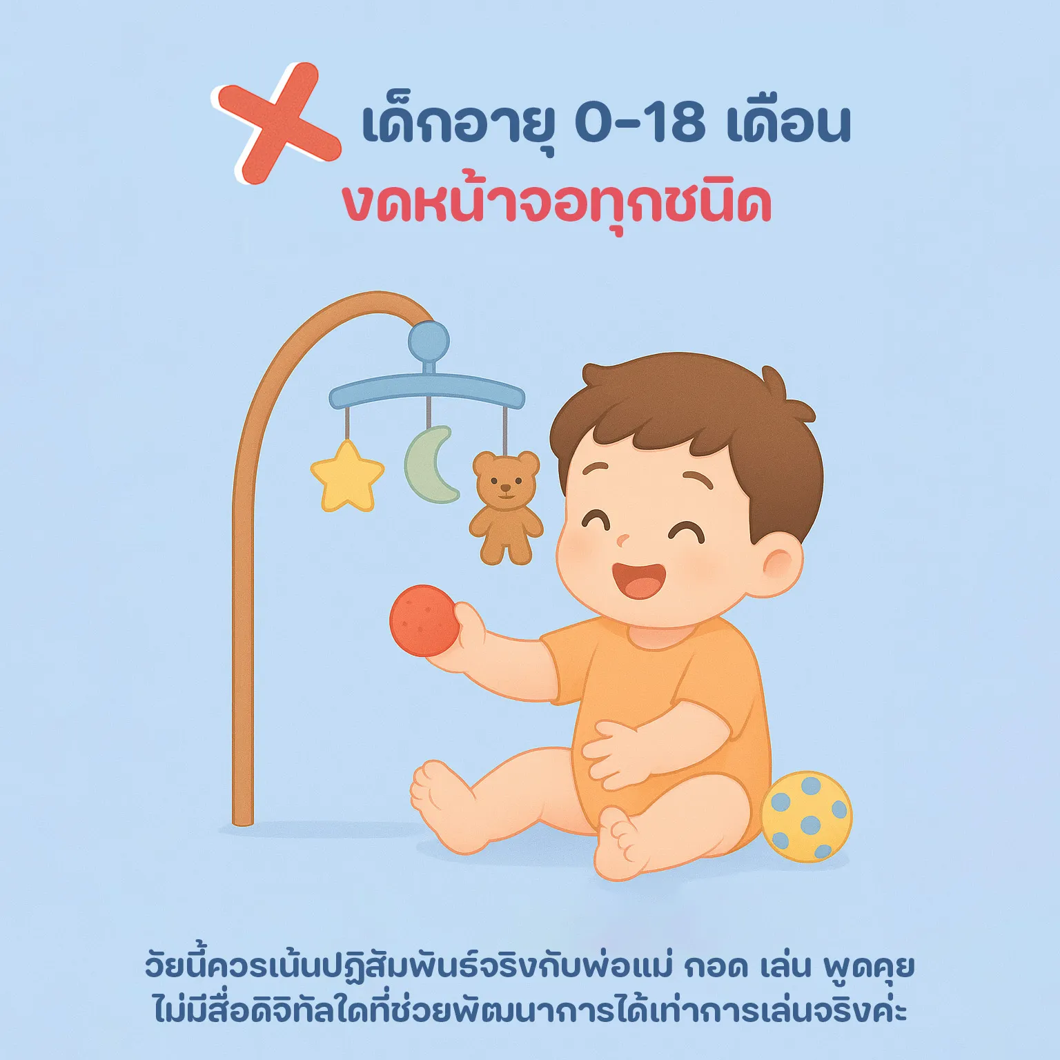 ช่วงวัยทารก 0-18 เดือนเป็นวัยที่สมองเติบโตเร็วที่สุด เด็กเรียนรู้จากการสัมผัสจริง การสบตา การกอด การเล่นกับพ่อแม่ ไม่ใช่จากหน้าจอใด ๆ การรับภาพแสงกระพริบหรือเสียงจากหน้าจออาจรบกวนสมองทารก ทำให้หลับยากและส่งผลต่อพัฒนาการด้านภาษาในอนาคต