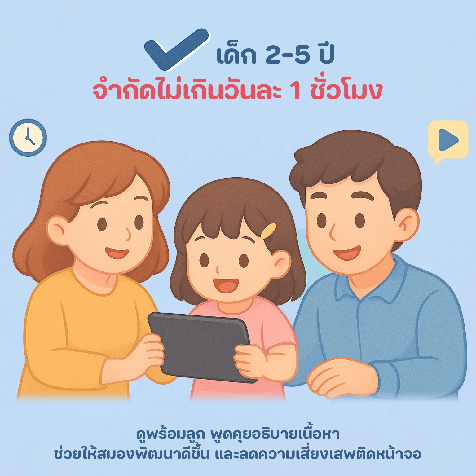 ในยุคที่หน้าจอเป็นส่วนหนึ่งของชีวิตประจำวัน การกำหนด Screen Time ให้เหมาะสมเป็นสิ่งสำคัญมากสำหรับพัฒนาการเด็กทุกวัย ทั้งพัฒนาการทางสมอง อารมณ์ ภาษา การเข้าสังคม และการนอนหลับ คู่มือนี้จัดทำขึ้นเพื่อช่วยให้พ่อแม่เข้าใจ ข้อแนะนำตามหลักกุมารแพทย์สากล พร้อมแนวทางปรับใช้ในชีวิตจริงที่ทำตามได้จริงในทุกบ้าน เป้าหมายคือ ไม่ใช่ห้ามลูกใช้หน้าจอ แต่คือ ให้ใช้ในปริมาณเหมาะสมและอย่างมีคุณภาพ