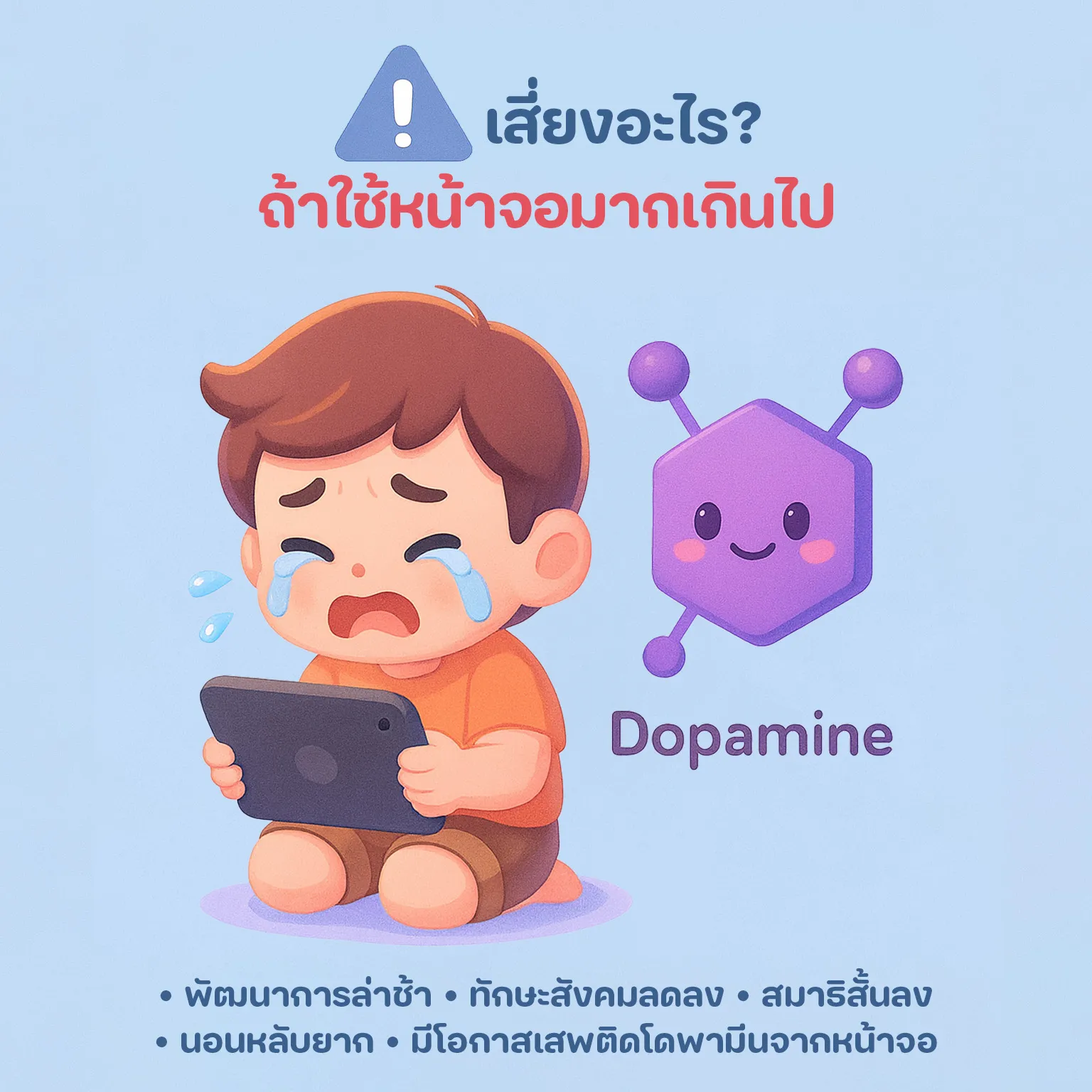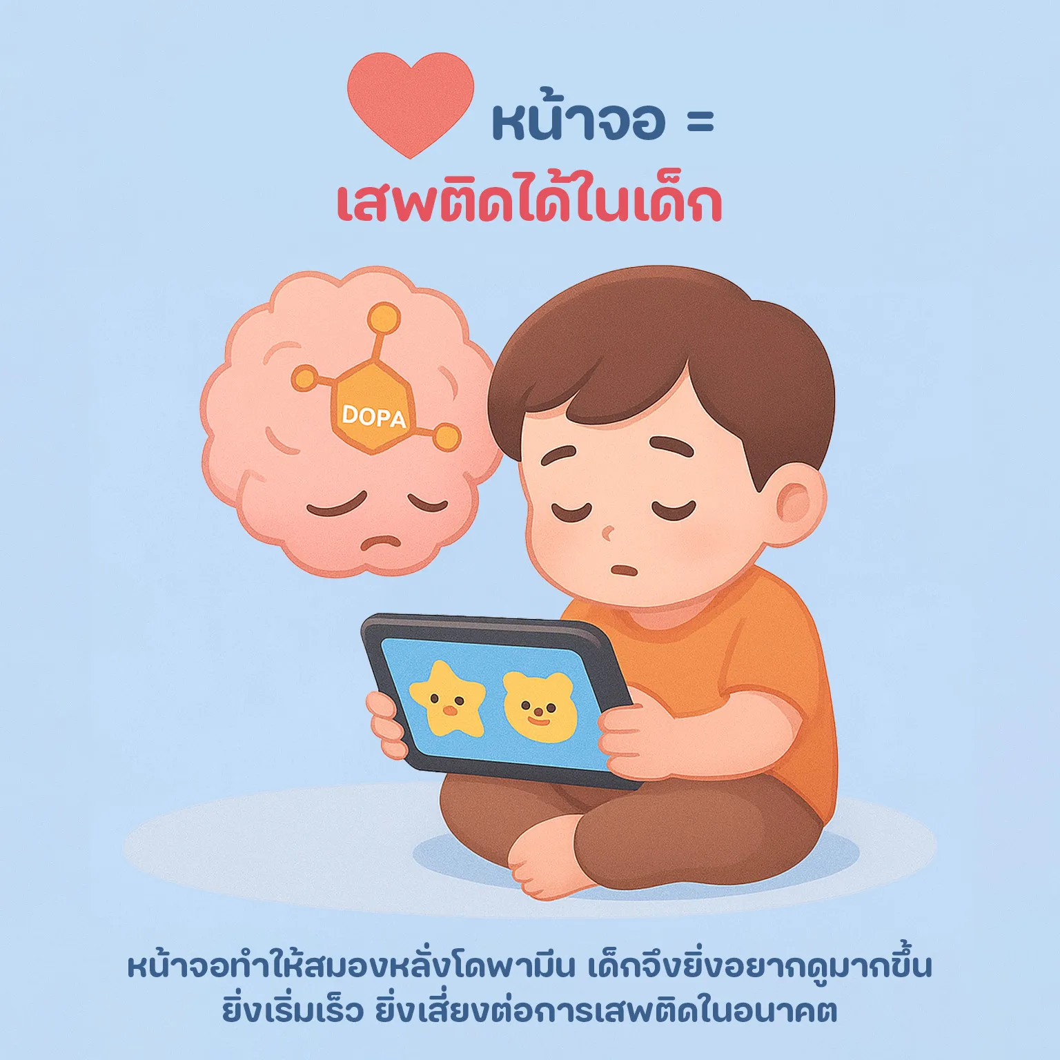 หน้าจอทำให้สมองหลั่ง โดพามีน ซึ่งเป็นสารแห่งความสุข ทำให้เด็กอยากดูต่อเรื่อย ๆ สื่อที่ตัดต่อเร็ว สีสด เพลงดัง และการ์ตูนที่เปลี่ยนฉากไว ล้วนกระตุ้นสมองจนเด็กเกิดอาการ ติด ได้เหมือนกับการติดเกมหรือขนมหวาน