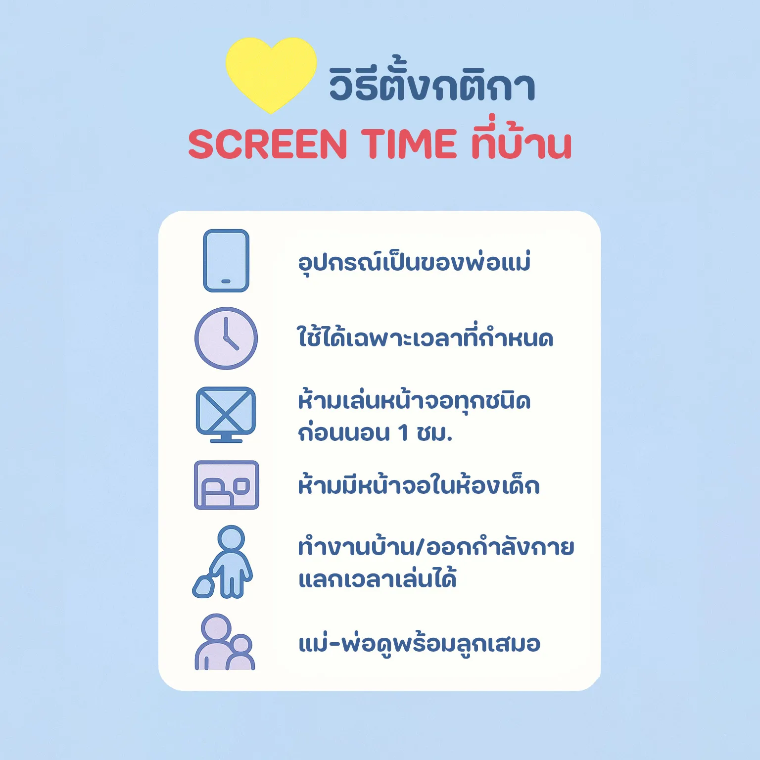 - ใช้ ภารกิจ แลกเวลาหน้าจอ เช่น เก็บของเล่น ออกกำลังกาย เล่นกลางแจ้ง